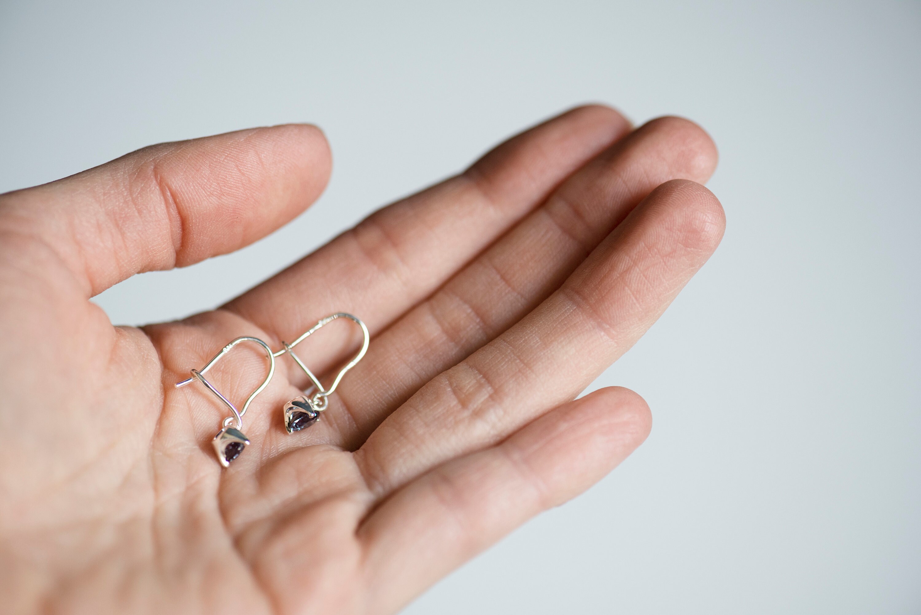 Delicate, minimalist but definitely not boring earrings with alexandrite - a stone which changes color depending on light condition. In daylight alexandrites are greenish cyan and in candle light (or any warm, yellow light) are purple. But most of time they shimmer in both colors at the same time - especially when you move your head and earrings dangle and catch the light from different angles.