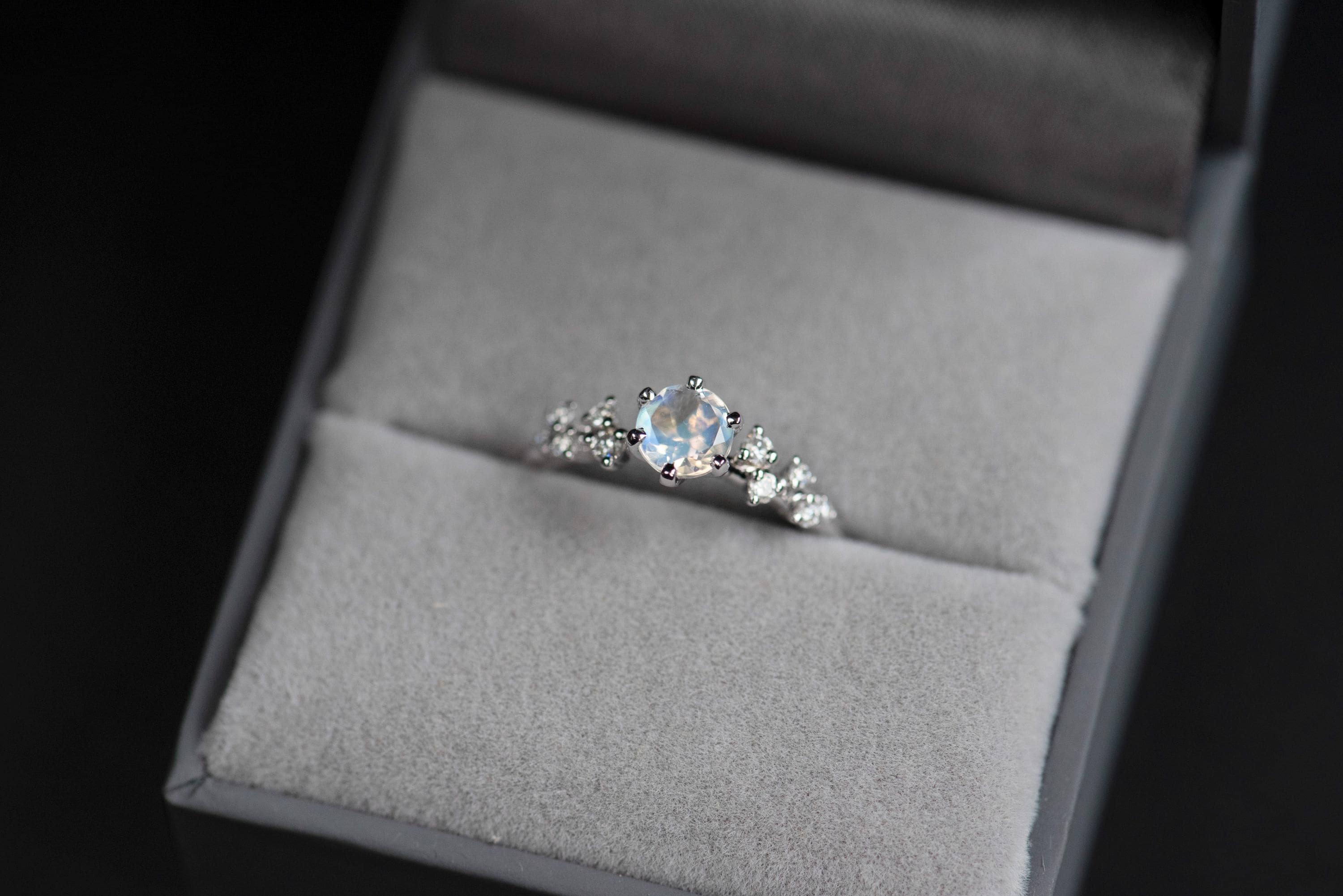 Are you looking for an unusual engagement ring? How about this moonstone and diamonds multistone engagement ring? The star of the ring is a moonstone - white and transparent stone, which surface changes when it catches the sun. It shimmers with blue or rainbow colors depends on particular stone set in the ring. You can choose it on your own - just let me know and I'll send you photos with available stones. Side stones (diamonds or moissanites) sparkle like drops of water and add a lot of blink. Because of the subtle (but still solid) shank the ring is really comfortable.